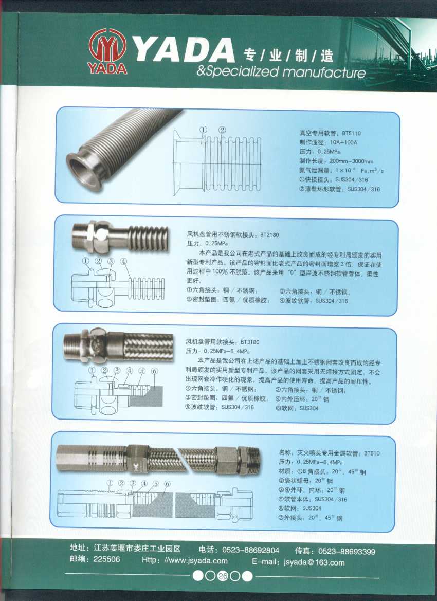 秉天時(shí) 籍地利 仰人和 虔誠(chéng)一個(gè)永恒的理念,創(chuàng)新永續(xù).百諾不如一信,亞達(dá)人堅(jiān)持以信為本,視客戶如同上帝,把對(duì)信譽(yù)的追求,體現(xiàn)在嚴(yán)格的質(zhì)量控制和完善的客戶服務(wù)上,讓客戶百分之百滿意是亞達(dá)人不變的信念。 本廠系ISO9001質(zhì)量認(rèn)證企業(yè)、計(jì)量合格企業(yè)。本廠專(zhuān)業(yè)致力于生產(chǎn)不銹鋼金屬波紋軟管、超高壓、高壓膠管、波紋管補(bǔ)償器(膨脹節(jié))、立式、臥式、冷卻器。本廠產(chǎn)品具有承受壓力高、彎曲半徑小、抗疲勞性能強(qiáng)、使用壽命長(zhǎng)等特點(diǎn)。廣泛應(yīng)用于電力、石化、冶金、水泥建材、工程機(jī)械、礦山及液壓系統(tǒng)。產(chǎn)品暢銷(xiāo)全國(guó)各地。 今日亞達(dá)之成功源自諸多客戶的厚愛(ài),明天的輝煌更離不開(kāi)您對(duì)我的支持與信賴(lài)。查看更多>>